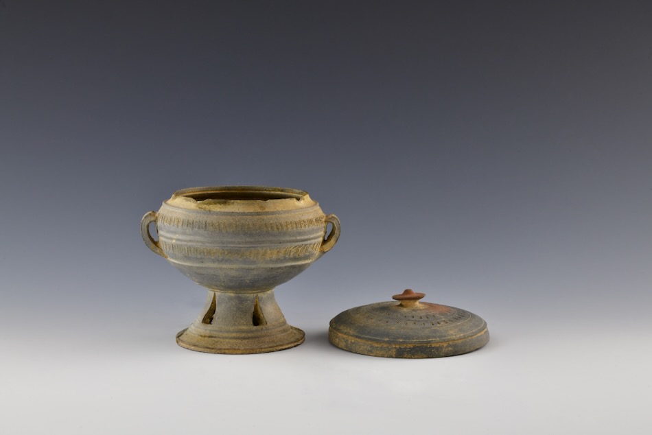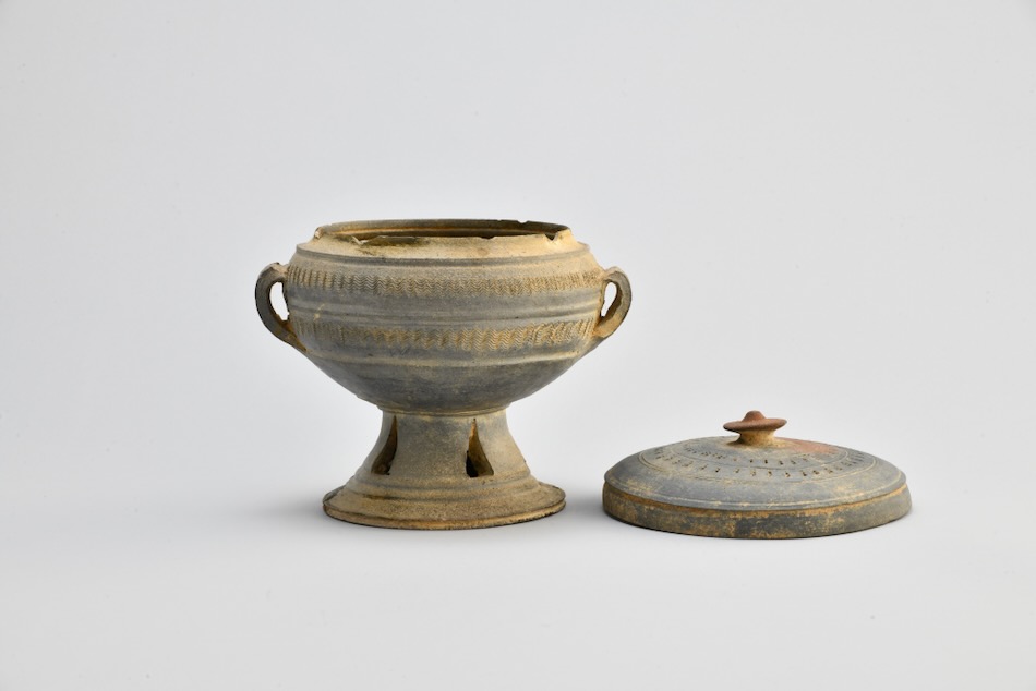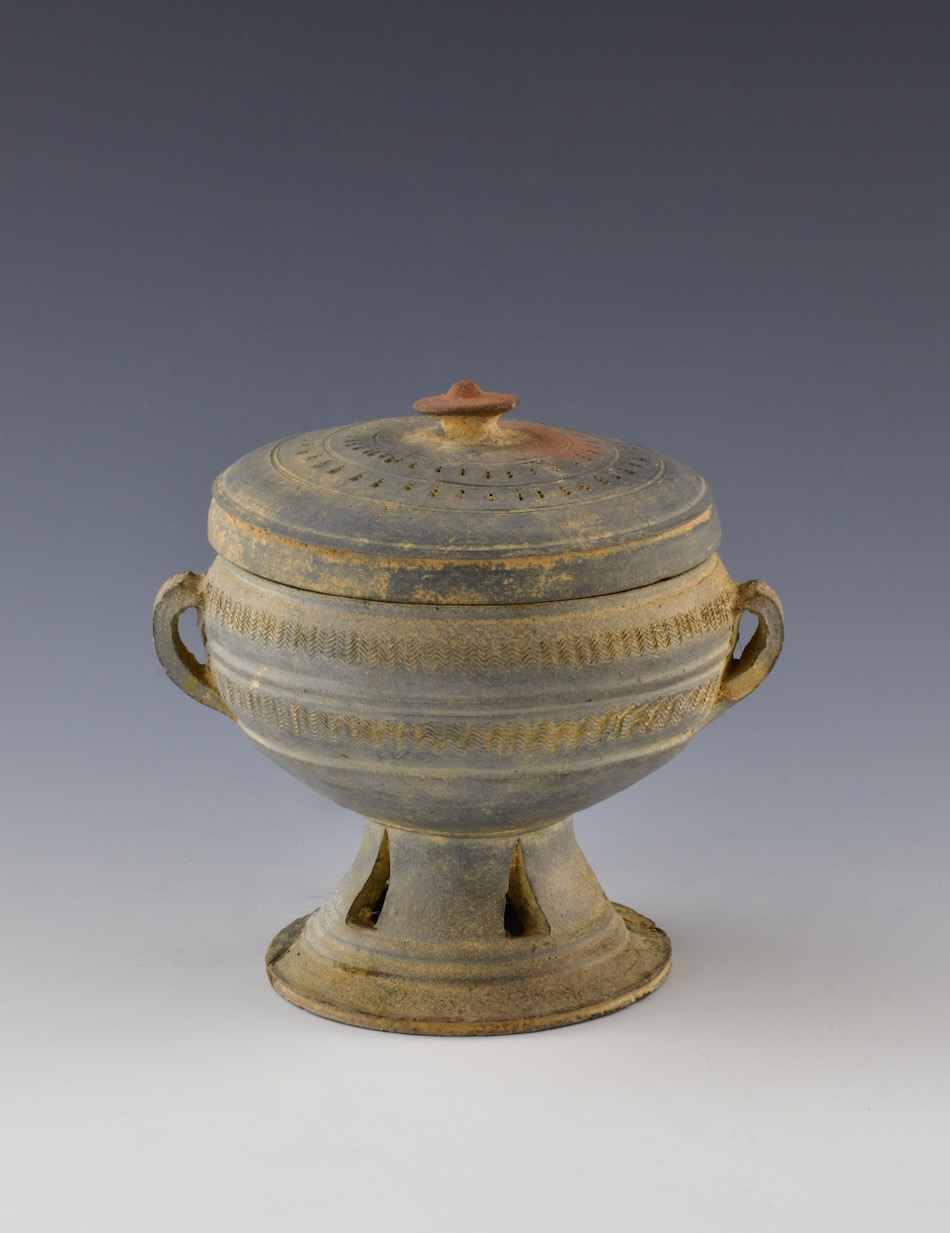 5世紀には朝鮮半島南東部の洛東江の東西で、陶質土器の形の違いも明確になり、おおむね新羅・加耶の領域と対応する。加耶は小国群の総称で、小国ごとに陶質土器の形にも差が生まれた。本作は優勝カップを彷彿とさせる二つの耳を持つ台付の鉢で、天井部を刺突文で飾る蓋が伴う。この形は、現在の慶尚北道高霊郡を拠点に、5世紀以降加耶で最大の勢力を誇った大加耶に特有の形である。