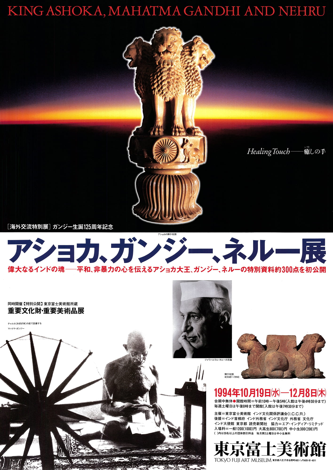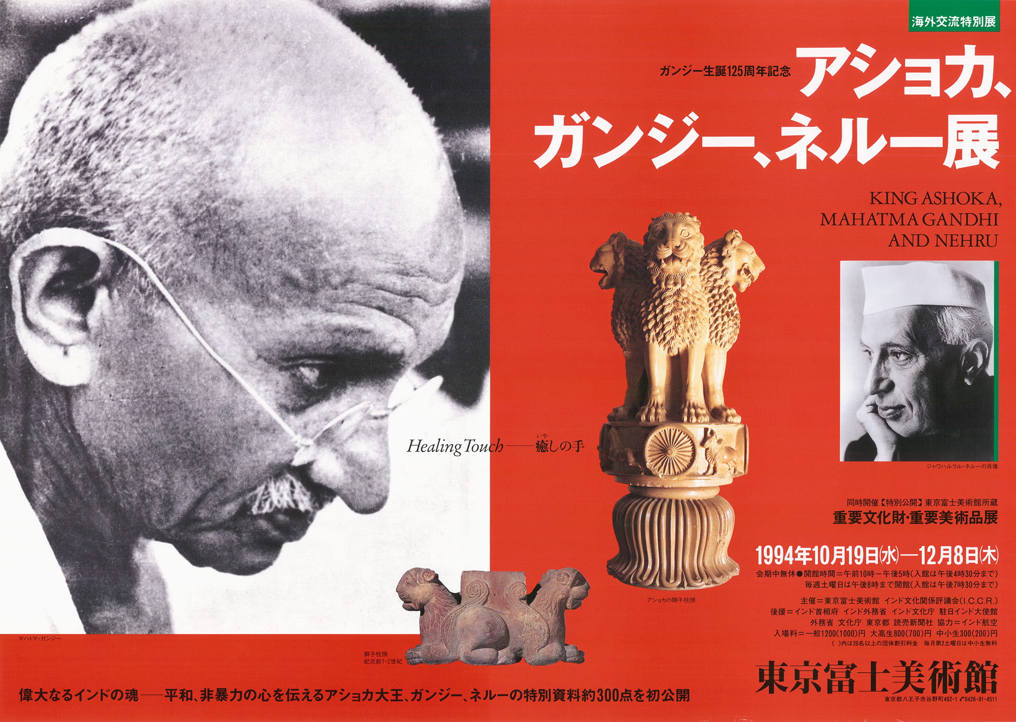 精神文明の大国インドは、平和と慈悲と非暴力の精神を体現した優れた指導者を輩出してきた。ブッダ(釈尊)を源流とするその行動哲学の命脈は、今から約2300年も昔に仏教を保護し、理想的な善政を行ったとされるアショカ大王から、時代を超えて今世紀のインド独立の父マハトマ・ガンジー(1869—1948)、そして独立後の初代首相となったジャワハルラル・ネルー(1889—1964)という、現代史に輝かしい足跡をしるした二人の人物へと受け継がれている。本展は、この三人に共通して流れ続けるインドの魂を「ヒーリング・タッチ—癒しの手」というキーワードに集約し、その精神と文化を伝える遺跡彫刻、遺品、資料など約300点によって紹介した。