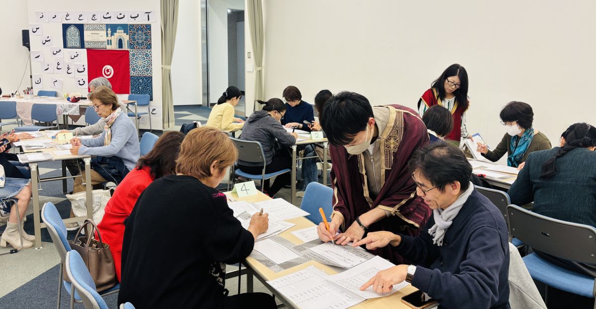 11月8日(土)、アラビアデザインとアラビア書道ワークショップを開催しました。講師のバスマ・ラリビさん(東京農業大学講師)とチームメンバーのご挨拶のあと、アラビア語通訳の西谷拓海さんより、アラベスク模様の歴史やそこに込められた意味についてのプレゼンテーションがありました。その後、参加者の皆さんはグループに分かれて、自分の名前をアラビア語で書くことに挑戦。バスマ・ラリビさんは、参加者一人ひとりの名前を筆ペンで美しいアラビア文字にしてプレゼントするなど、温かい交流の場となりました。さらに、アラビア語の紙芝居の読み聞かせや、アラベスク模様の塗り絵でつくるしおりづくりも行い、お子様から大人まで笑顔あふれるひとときとなりました。